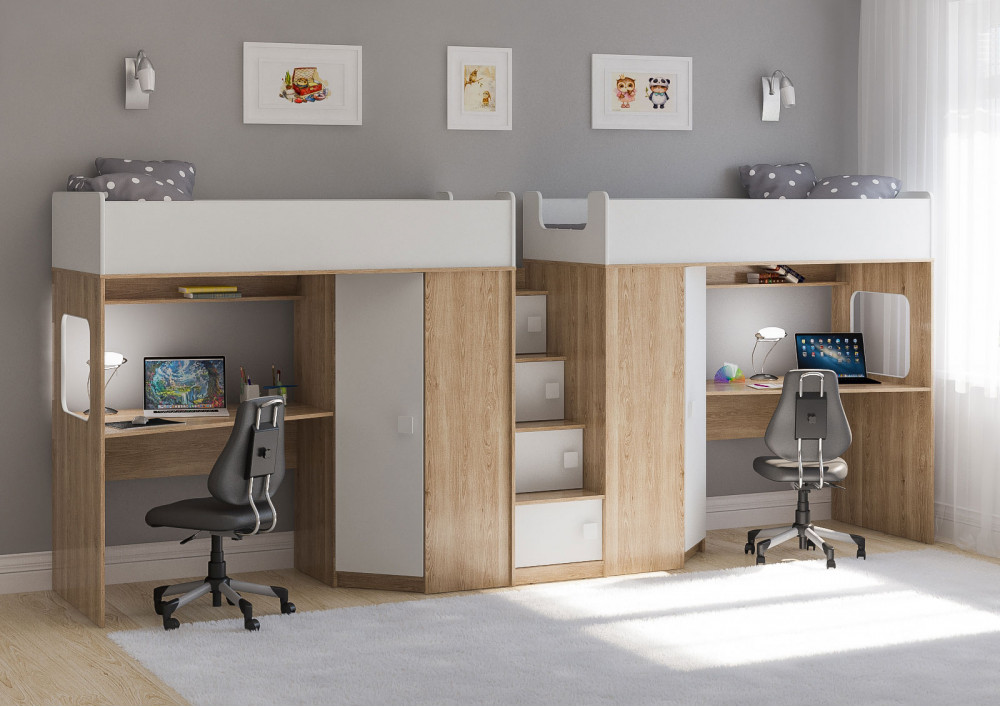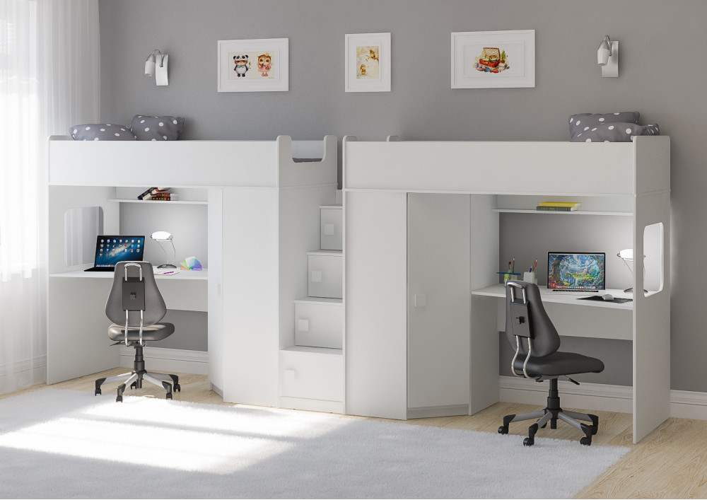 Под спальным местом для каждого ребенка располагается рабочее место с встроенным столом.