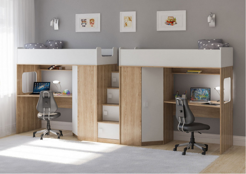 Две кровати, два шкафа, две игровых зоны – одна лестница. Идеальный вариант для двоих детей!