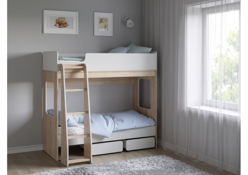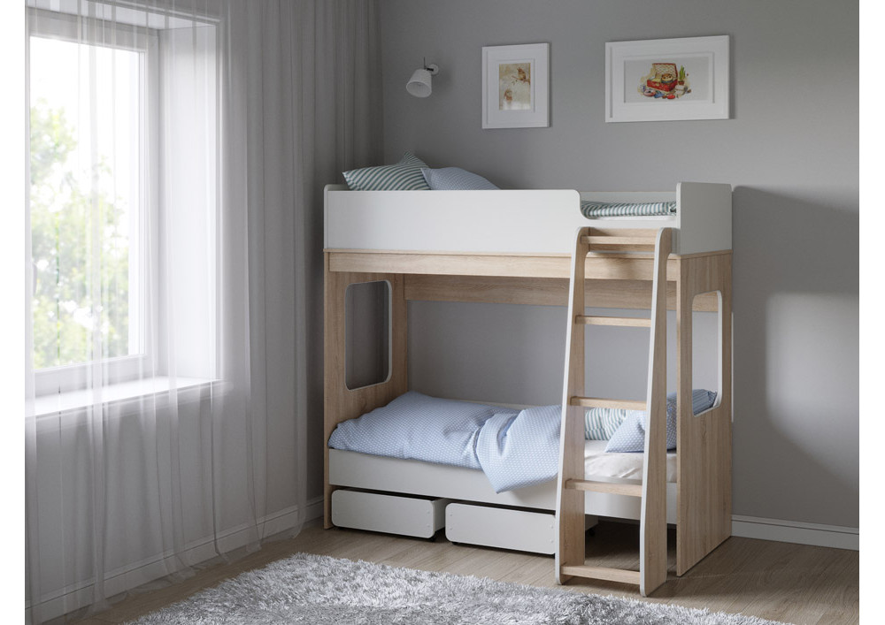 2 ящика внизу кровати обеспечат хранеие игрушек и порядок в комнате. Ящики оборудованы прямохоными колесными опорами.