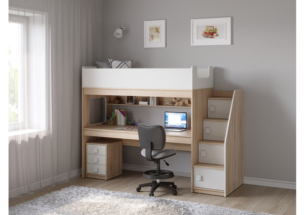 Учебная зона со столом под спальным местом открывает возможности для письменных работ,а также здесь удобно расположить ноутбук, а вместительная тумба поможет в хранеии канцелярских принадлежностей и учебников.