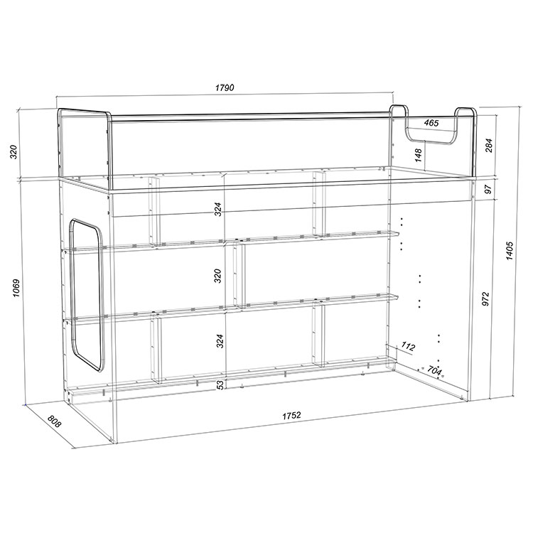 Под верхним спальным местом располагается стеллаж, отлично подходящий для хранения игрушек.